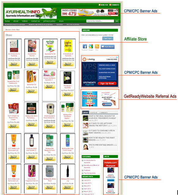 We will do this for your website. Your website will be handed over to you with pre Installed Website Store (i.e Flipkart Store), Affiliate ads (i.e Axill.com or Google Adsense) and GetReadyWebsite referral ads.